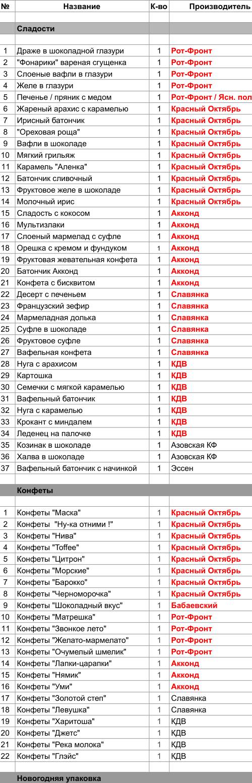 Жареный арахис с карамелью (1 шт), Ирисный батончик (1 шт), "Ореховая роща" (1 шт), Вафли в шоколаде (1 шт), Мягкий грильяж (1 шт), Карамель "Аленка" (1 шт), Батончик сливочный (1 шт), Фруктовое желе в шоколаде (1 шт), Молочный ирис (1 шт), Конфеты "Маска" (1 шт), Конфеты "Ну-ка отними !" (1 шт), Конфеты "Нива" (1 шт), Конфеты "Toffee" (1 шт), Конфеты "Цитрон" (1 шт), Конфеты "Морские" (1 шт), Конфеты "Барокко" (1 шт), Конфеты "Черноморочка" (1 шт)